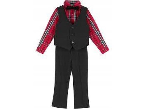 - 4-elementowy oficjalny strój w skład którego wchodzi koszula czerwona w kratę, kamizelka czarna zapianan na guziki, muszka i spodnie w kant